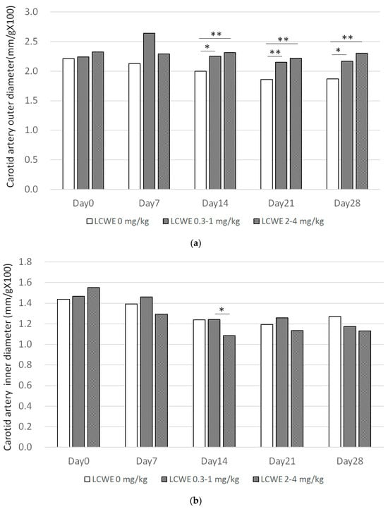 The flowchart of this study is presented in Figure 1, illustrating the key components such as the animals involved, the timeline of the study, and the echography procedures. As shown in Figure 2, echocardiography of the LCWE group’s (intraperitoneal injection 2 mg/kg for 7 days) coronary artery diameter on day 28 after study was significantly greater than that of the control group (no LCWE treatment). The normal range of coronary artery diameter was found to be 0.217 ± 0.028 mm (N = 18), while the outer coronary artery diameter was 0.472 ± 0.056 mm (N = 37). Sonography of carotid artery wall thickness in the LCWE group on day 28 after the study showed a significant increase compared to the control group (Figure 3). Carotid artery wall thickness significantly increased in the LCWE group with the narrowing of the internal diameter when compared with the control group.