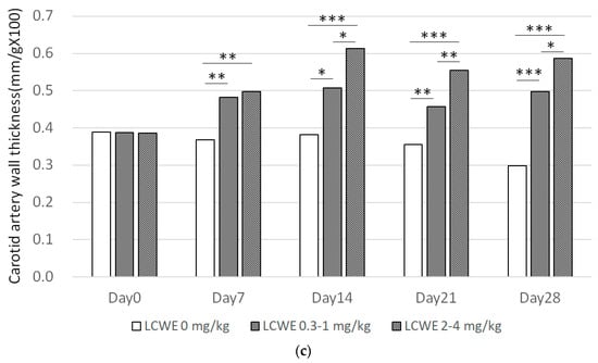 (a,b) Carotid artery diameter with different LCWE dosages and times. (c) Carotid artery wall thickness significantly increased with dose and was time dependent. Calculation formula = upper wall of carotid artery wall + lower wall divided by 2 divided by body weight multiplied by 100. (* p < 0.05, ** p < 0.005, *** p < 0.0005).