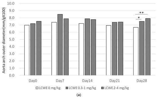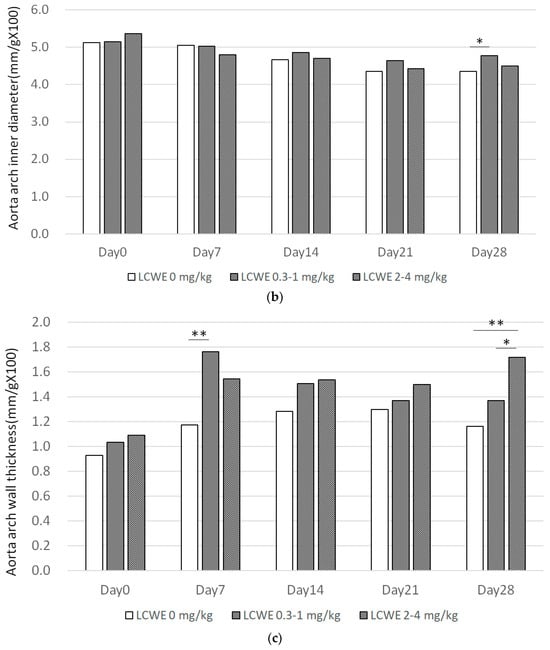 (a) Aorta outer diameter with different LCWE dosages and time showed a significant increase on day 28. (b) Aorta inner diameter with different LCWE dosages and time showed a significant increase on day 28. (c) Aortic arch wall thickness significant increased in LCWE group. Calculation formula = upper + lower aortic wall divided by 2, divided by body weight multiplied by 100. (* p < 0.05, ** p < 0.005).