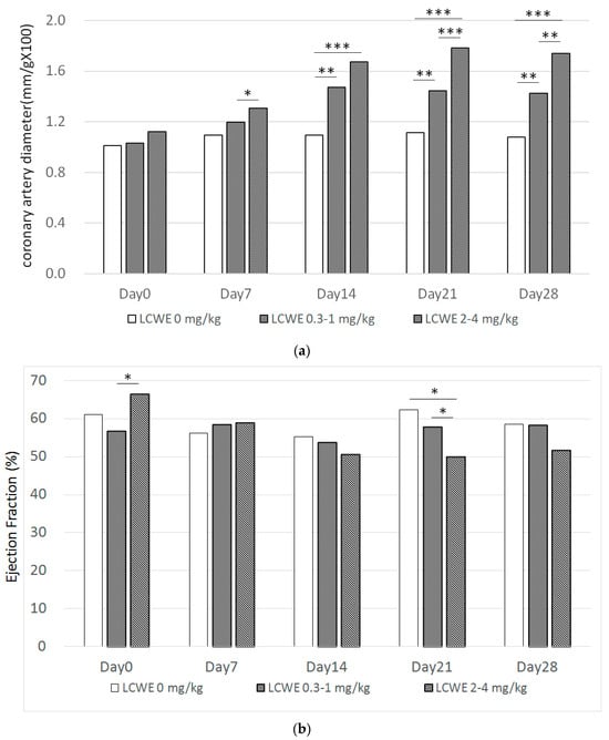 (a) Coronary artery diameter with different LCWE dosage and time showed a significant increase after day 7. (b) Ejection fraction showed significant decrease in LCWE group. (* p < 0.05, ** p < 0.005, *** p < 0.0005).