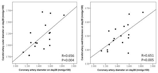 Carotid artery outer diameter and wall thickness were positively associated with coronary artery diameter on day 28. Calculation formula = upper wall of carotid artery wall + lower wall divided by 2 divided by body weight multiplied by 100.