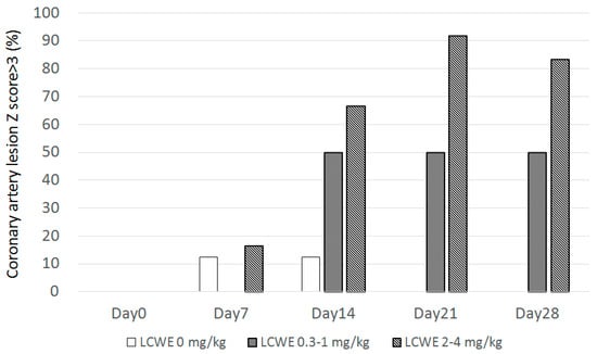 Z-score was set up using all mice (N = 38) on day 0 before any treatment and calculated with the mean to obtain the standard deviation (SD) by using regression with the square root of body surface area. This study marks the first time the Z-score has been analyzed in a KD mouse model from the literature review. Z-score can more precisely detect coronary artery lesions in a mouse model. The percentage of Z > 3.0 (3.0 SD greater than the mean value) was more than 80% with a high dose and 50% with a medium dose in the LCWE group and was 0% in the control group from day 21 to day 28 (Figure 8). When a Z-score > 3.0 was applied in this mouse model of KD, more than 80% of CALs were detected after day 21 without sacrificing any animals.
