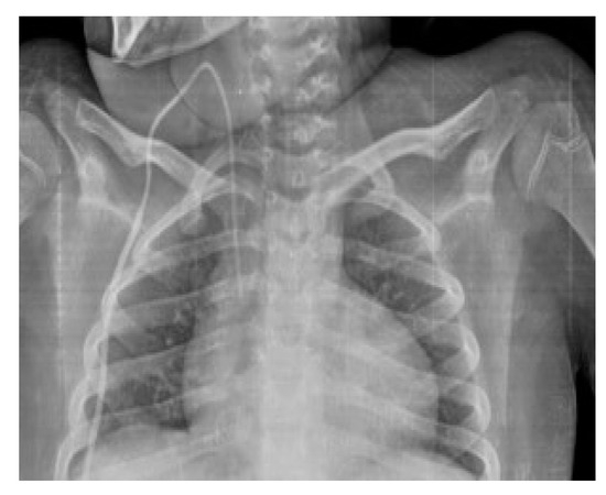 The radiologist’s report should include precise details of the catheter’s distal apex location, utilizing significant anatomical or vertebral landmarks. This information is crucial for clinicians to fully comprehend the radiogram evaluation. In addition to catheter placement, any complications noticed during chest or abdominal X-rays should be documented in the report. For example, CVCs and PICCs should be examined for pneumothorax, while pulmonary opacities on chest X-rays can be indicative of lung infections [36]. There are other complications that are well-documented such as pleural effusion or hydrothorax [37]. These can be caused by the perforation of a central vein during or after catheter insertion, obstruction of the thoracic duct outlet by the catheter tip or thrombus, erosion of vessels due to mechanical and chemical irritation, infusion of hyperosmolar solutions that may damage the vessel without direct perforation by the catheter, and thrombosis of the superior vena cava, which can result in chylothorax. Additionally, catheter ruptures, intestinal occlusions, and perforations caused by necrotizing enterocolitis (resulting from the occlusion of mesenteric vessels) have been reported. Lastly, hepatic vessel rupture may occur, which can cause extravasation into the peritoneal cavity, resulting in ascites and/or hemoperitoneum. The use of a chest X-ray can provide indications of thrombosed embolisms, which may be identified through signs like Westermark’s sign, Hampton’s sign, or pleural effusion [1,2,31,38,39].