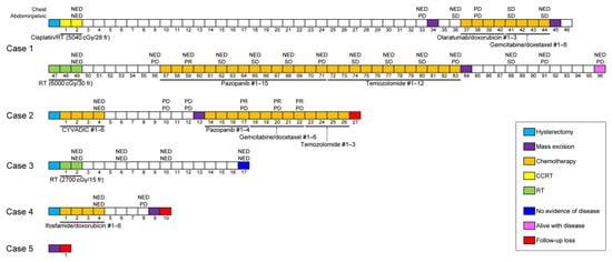 Timelines of patients’ clinical course. #—cycle of chemotherapy; CCRT—concurrent chemoradiation therapy; NED—no evidence of disease; PD—progressive disease; PR—partial response; RT—radiation therapy; SD—stable disease.