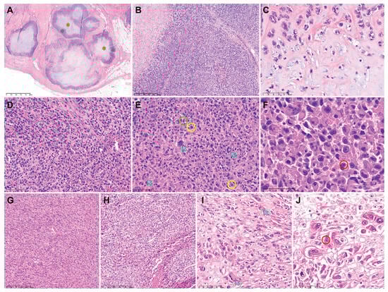 Histological features of uterine DDLMS (cases 1−3). Case 1: (A) The metastatic lesion exhibits variable-sized multinodular tumors. Each nodule consists of a peripheral rim of dedifferentiated component (blue asterisks) and CSA (yellow asterisk) at the center. (B) The dedifferentiated component is characterized by UPS-like morphology. (C) The heterologous component displays CSA. Case 2: (D) The dedifferentiated component shows non-cohesive polygonal cells with moderate eosinophilic cytoplasm and large pleomorphic nuclei. (E) Some multinucleated tumor giant cells can also be observed (blue arrows). Brisk mitotic activity (green circle) with occasional atypical mitotic figures (yellow circles) is noted in the dedifferentiated component. (F) High-power magnification reveals large polygonal cells possessing abundant eosinophilic cytoplasm and eccentrically placed nuclei with marked pleomorphism, compatible with RMS. Some tumor cell nuclei display one or more conspicuous nucleoli (red circle). Case 3: (G,H) The differentiated components show the histological features of (G) spindle cell LMS and (H) epithelioid LMS. (I,J) The dedifferentiated component shows scattered pleomorphic tumor cells possessing (I) abundant eosinophilic cytoplasm (blue arrows) and (J) eccentrically placed nuclei with conspicuous macronucleoli (red circle). Original magnification: (A) 20×; (B), 40×; (C–E), 200×; (F), 400×; (G,H) 40×; (I,J) 200×.
