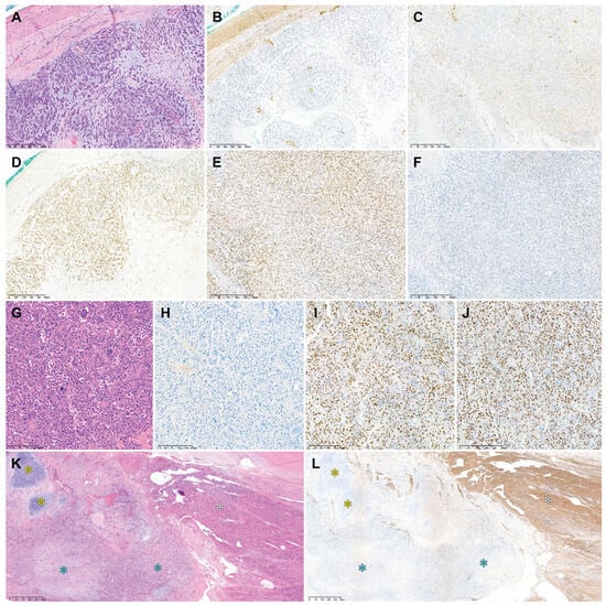 Immunostaining was performed using whole-tissue sections containing >80% viable tumor tissue, as previously described [24,25,26,27,28,29,30,31,32]. In brief, 4 μm thick FFPE tissue sections were deparaffinized and rehydrated using a xylene and alcohol solution. We used an automated instrument (BOND-MAX immunostainer; Leica Biosystems, Deer Park, IL, USA) with a biotin-free polymeric horseradish peroxidase-linker antibody conjugate system (BOND Polymer Intense Detection System; Leica Biosystems) [33,34,35,36]. After antigen retrieval, endogenous peroxidases were quenched with hydrogen peroxide. The sections were incubated with the primary antibodies listed in Table 1. After chromogenic visualization, the sections were counterstained with hematoxylin and coverslipped. The appropriate positive controls listed in Table 1 were stained, while the negative control was prepared by substituting non-immune serum for the primary antibodies, resulting in no detectable staining. For desmin and S100 protein, staining in the cytoplasm or membrane was interpreted as positive expression. For myogenin, myoD1, and special AT-rich sequence-binding protein 2 (SATB2), nuclear staining was interpreted as positive expression [24,28,37]. The staining intensity was graded as strong, moderate, or weak, while the staining proportion was graded as either diffuse (≥50%) or focal (<50%). For retinoblastoma protein (RB), even weak nuclear staining indicated preserved expression, whereas loss of expression was defined as the complete absence of nuclear immunoreactivity. p53 expression was interpreted as a mutation pattern when one of the following staining patterns was observed [38]: diffuse (≥75%) and strong nuclear immunoreactivity (overexpression); no nuclear immunoreactivity in any of the tumor cells (complete absence); or unequivocal cytoplasmic staining (cytoplasmic). In contrast, p53 expression was interpreted as a wild-type pattern if a variable proportion of nuclear expression with mild-to-moderate staining intensity was observed.