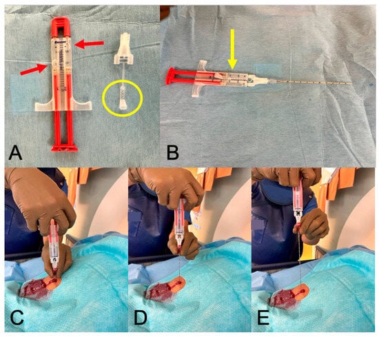 Fibrin glue sealant—practical implementation. Legend: In (A), the thawed fibrin two-component adhesive is displayed, with two air bubbles visible in the sealed tubes (red arrows). Adjacent to it is the attachment cap and its lug (yellow circle). (B) depicts the adhesive with the attachment securely locked (yellow arrow), along with the 17G coaxial needle attached to it. (C–E) illustrate the process of gluing the puncture channel: the needle is gradually withdrawn while a continuous stream of 2 mL of glue is being administered.