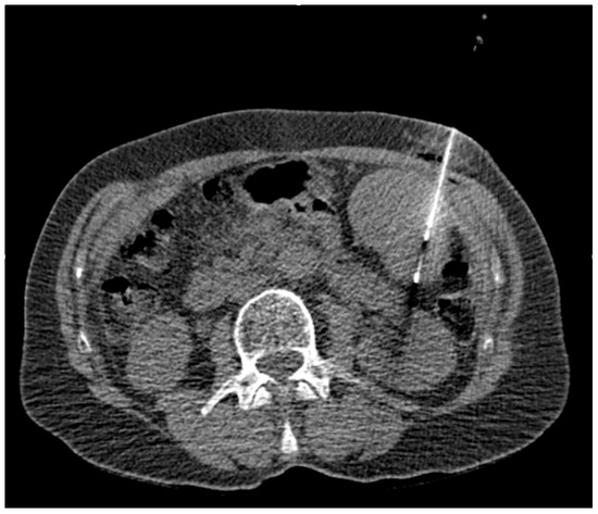 Focal splenic lesions that cannot be classified by computed tomography (CT) or magnetic resonance imaging (MRI) are rare. Yet, a diagnostic work-up can be challenging in these cases, and in some cases, histological results are required for further work-up [1,2]. In the past, patients underwent splenectomy to establish the correct diagnosis by histology [3]. Most splenic masses, such as cysts and hemangiomas, are benign lesions, and the most common malignant lesions, like manifestations of lymphoma or splenic metastasis, are usually identified in systemic reviews [4,5]. Only rarely do patients require an operation and splenectomy. Therefore, a surgical procedure would be unnecessary and will not treat systemic disease. Because of the high blood flow to the spleen, biopsy used to be rather uncommon due to the inherent high risk of bleeding, with studies reporting a high rate of complications [6,7]. But as an operation with splenectomy is also not without its risks, it can be an advantage to perform a percutaneous biopsy and spare patients a splenectomy [8]. Since then, several studies and meta-analyses have been performed on the percutaneous image-guided biopsy of the spleen and the risk of bleeding [9,10]. There is an ongoing debate as to which biopsy needles are best in this regard, and different studies have been published comparing different needles [11,12]. Additionally, endoscopic ultrasound-guided tissue acquisition has been introduced as another alternative [13].