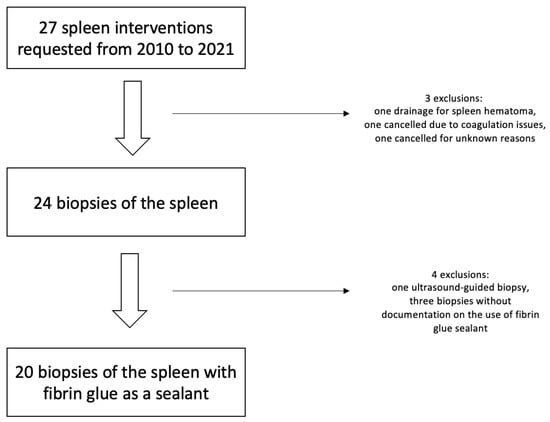 A total of 27 requested splenic interventions were identified between 2010 and 2021; Figure 3. Three requests were excluded: one was a drainage of a hematoma, one was canceled because of coagulation issues, and one was not carried out for unknown reasons. The remaining 24 patients with unclear splenic lesions underwent biopsy and were considered for this study. Twenty-three patients underwent CT fluoroscopy-guided biopsy, of which twenty were carried out with a fibrin glue as a sealant. One patient had an ultrasound-guided biopsy with fibrin glue sealant. The ultrasound-guided biopsy and the three biopsies without fibrin glue were excluded.