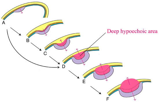 A schema showing vertical growth of polypoid carcinoma of the gallbladder: Changes in the ultrasound image and pathology. Light purple and rose berry areas represent shallow hyperechoic and deep hypoechoic parts, respectively. Dotted lines show the assumed deepest lines of muscle coat. In a protruded lesion, while a well-differentiated adenocarcinoma in the mucosa changes into moderately to poorly differentiated adenocarcinoma in the muscle coat, the lesion is drawn into the lumen. Thus, the outermost hyperechoic layer (yellow areas) is pulled up at first (B and C). Thereafter, the layer becomes thinner and eventually splits as carcinoma invasion progresses with enlargement of the deep hypoechoic area (D→E→F). In contrast, in the case of a flat-elevated lesion, the vertical growth is expected to go directly from A to D without going through B and C (adapted from Fujimoto et al. [5] with modification).