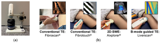 - Xu, Y.; Liu, Y.; Cao, Z.; Wang, L.; Li, Z.; Sheng, Z.; Cai, W.; Wang, H.; Bao, S.; Xie, Q. Comparison of FibroTouch and FibroScan for staging fibrosis in chronic liver disease: Single-center prospective study. Dig. Liver Dis. 2019, 51, 1323–1329. [Google Scholar] [CrossRef] [PubMed]