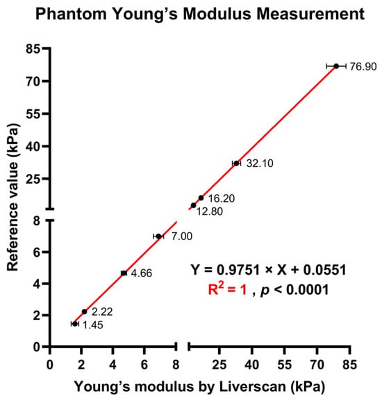 Measurement of Young’s modulus across eight phantoms with known reference values: scatterplot showing the linear relationship of the Young’s modulus of the phantoms derived by Liverscan against the truth values.