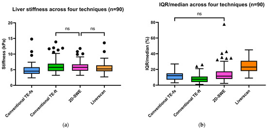 Aggregated results of (a) liver stiffness (kPa) and (b) IQR/median of LSMs (%) among four elastography techniques (ns: p > 0.05; p ≤ 0.05 otherwise).