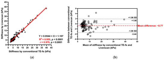 Liver stiffness measured by conventional TE-fs vs. Liverscan. (a) Scatterplot with Pearson correlation and simple linear regression analysis; (b) Bland–Altman analysis.