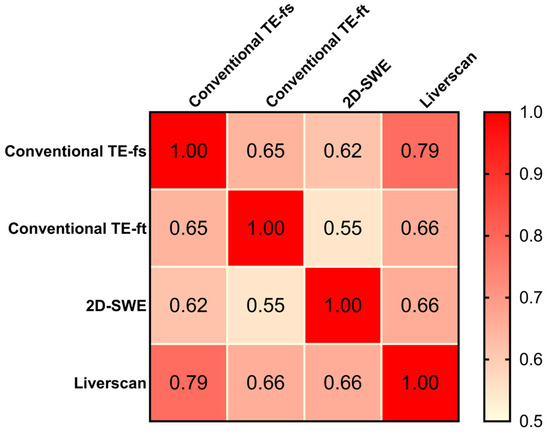 The correlation matrix results of 90 patients showed positive and statistically significant Pearson correlation coefficients of all pairs (r ranging from 0.55 to 0.79, p < 0.001), indicating that liver stiffness measured by the four techniques were inter-correlated (Figure 6). As the only technique allowing the mapping of fibrotic distribution, 2D-SWE exhibited a similar correlation with conventional TE-fs (r = 0.62, 95% CI: 0.471 to 0.731, p < 0.001) and Liverscan (r = 0.66, 95% CI: 0.524 to 0.762, p <0.001). The strongest correlation was observed in the pair of conventional TE-fs vs. Liverscan, with a Pearson correlation coefficient of 0.79 (95% CI: 0.691 to 0.854, p < 0.001). Conventional TE-fs correlated nominally more with Liverscan (r = 0.79) than with conventional TE-ft (r = 0.65, 95% CI: 0.507 to 0.752, p < 0.001) and with 2D-SWE (r = 0.62, 95% CI: 0.471 to 0.731, p < 0.001). This relationship was confirmed by linear regression and Bland–Altman analyses, where conventional TE-fs and Liverscan demonstrated the lower mean difference of −0.69 kPa (95% limit of agreement: −2.91 to 1.54) and stronger linearity (R2 = 0.617, p < 0.001) than other pairs (See Supplementary Figures S1 and S2).