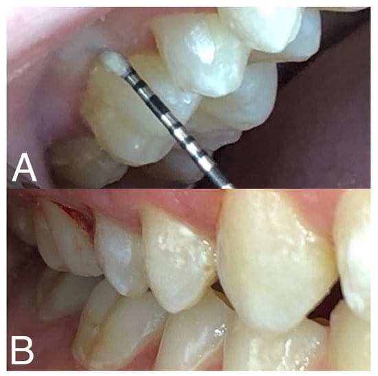 Photographs captured during clinical assessment of a phenylketonuria patient. Photograph (A) depicts the evaluation of plaque accumulation along the gum line using a periodontal probe. Photograph (B) exhibits minor bleeding of gingiva on the buccal and mesial surfaces of an upper right first molar following gentle probing during examination.