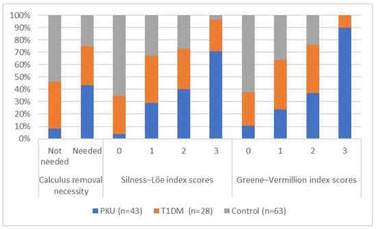 In all, 93% of individuals in the PKU group required calculus removal, indicating the highest prevalence of calculus deposits among all three groups; this was followed by 68% among the control group individuals and 54% among the T1DM group patients. PKU patients exhibited the worst scores in the Silness–Löe and Greene–Vermillion indices. The percentage of individuals with the maximum score of three, implying more pronounced gingival inflammation, was by far the highest in the PKU group for both oral hygiene indices. Scores of two and one were distributed similarly across the groups, but the number of participants with a score of zero was highest in the control group for both indices. All results regarding the oral health hygiene index scores are presented in Table 3 and Figure 2 below.