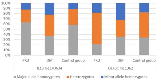 Current research results on the associations of genetic variants with periodontitis severity are highly variable. Although we did not find any prior studies that looked at periodontitis risk in conjunction with oral hygiene indices and PKU/T1DM patients specifically, the role of genetic variants is a widely studied subject in a variety of populations and study designs. Regarding DEFB1 rs11362 and periodontitis, the current research shows variable results. While some authors have been able to prove a role of DEFB1 rs11362 in increased periodontal disease severity [,,], other research did not find any such association [], and some authors argue that DEFB1 rs11362 is linked to an increased caries development risk, rather than periodontitis [,]. The inconsistency in these results could be due to the multifactorial nature of periodontitis, as it is very difficult to account for all etiological factors that could be influencing the disease severity in each study population. In our study, we included individuals with well-controlled T1DM. There are several examples in the existing research where the IL1B rs1143634 variant was not proven to increase periodontal disease risk [,]. However, some authors have found a statistically significant association between IL1B rs1143634 and periodontitis severity [,,].