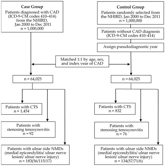Building on our prior research, we randomly selected 64,025 subjects newly diagnosed with CAD (ICD-9-CM codes 410-414) as the case group and 64,025 individuals without CAD as controls from the same NHIRD database. The controls were frequency-matched to the cases by age (within 5 years), sex, and index year of CAD. The index year of CAD for each case was defined as the year of the initial diagnosis, while for the controls, it was randomly assigned between January 2000 and December 2011 and aligned with the index year of the matched CAD case. In this study, all the participants were screened between January 2000 and the end of 2011 and subsequently monitored until their death, or the onset of a CTS (ICD-9-CM codes 354.0, 354.1), stenosing tenosynovitis (ST; ICD-9-CM code 727.04), or ulnar side NMDs, including medial epicondylitis (ICD-9-CM code 726.31), ulnar nerve lesion (ICD-9-CM code 354.2), or ulnar nerve injury (ICD-9-CM codes 955.2), all of which were previously diagnosed in all the participants for intergroup comparison at the individual level, to evaluate their relevance to CAD.