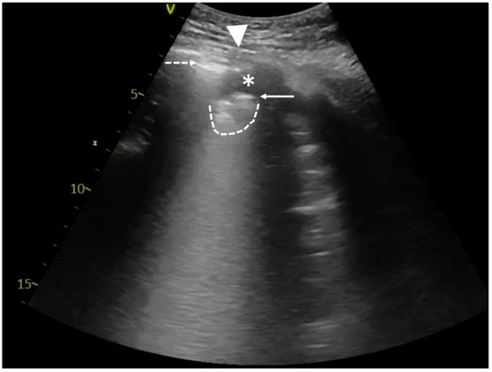 Point-of-care LUS of a 59-year-old smoker with COPD and severe ARDS. LUS was obtained with 1.8–6 MHz convex probe during vv-ECMO therapy and baby lung ventilation (Bilevel; FiO2 40%; PL10 cmH2O; PH 5 cmH2O; Vt~100–150 mL). Considering the LUS images obtained in the previous days (bilateral consolidations), the A-profile on the left side of chest wall was unusual. A careful assessment with LUS revealed the hydro-point, where a pleural effusion in the left pleural cavity coexisted with pneumothorax. Pneumothorax is present on the left side of the image with a blurred line of the parietal pleura (dashed arrow), and no horizontal reverberations developed at the air/tissue boundary. On the right side of the image, fluid in the pleural cavity (asterisk) and irregular, fragmented pleural line (solid arrow) with the subpleural consolidation (dashed line) can be observed. The contact point of both is called hydro-point (triangle), one of the non-typical LUS images confirming the presence of pneumothorax. This dynamic sign, occurring suddenly and transiently on the ultrasound image, can be seen in Video S2.
