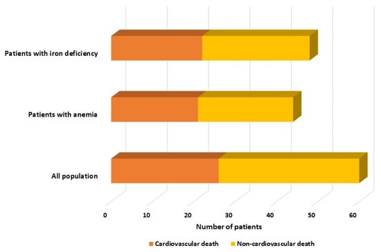 Within the group, 26 patients died from cardiovascular causes, while 34 patients died from non-cardiovascular causes such as sepsis, cancer, bacterial pneumonia, and COVID-19. Interestingly, the mortality rate for cardiovascular reasons was quite similar in both groups, with 47.7% (21 out of 44) in the anemic HFpEF group and 45.8% (22 out of 48) in the HFpEF patients with ID group, as illustrated in Figure 1. Patients with anemia or ID had higher rates of both cardiovascular and non-cardiovascular mortality than those without (p < 0.001).