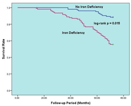 Comorbidities can significantly impact the survival and prognosis of individuals with HF. Many comorbidities have been shown to increase mortality and morbidity in patients with HF [3]. Anemia and iron deficiency (ID) are common pathologies that require management in clinical practice, similar to HFpEF. One of the leading causes of anemia globally is ID [4]. Anemia or ID’s presence can lead to poor clinical outcomes in various cardiovascular and non-cardiovascular conditions such as HFrEF, ischemic heart disease, chronic kidney disease, inflammatory bowel diseases, and cancer [5,6,7,8,9]. HF guidelines recommend iron therapies and target values in patients with HFmrEF and HFrEF [1,5]. However, there are insufficient data to form a clear opinion on the prognostic importance of anemia and ID in patients with HFpEF, who comprise a significant portion of the HF population. A better understanding of how these two common conditions, frequently found with HFpEF, affect clinical outcomes may lead to new treatment research. Therefore, our objective was to evaluate the effect of anemia and ID on long-term survival. We conducted long-term follow-ups on a cohort of patients with HFpEF.