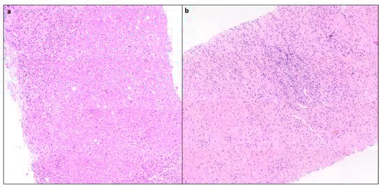 (a) Liver biopsy showing foci of spotty necrosis and lobular inflammation: (a) mHAI- C = 3, (b) mHAI- C = 2 (H&E × 200).