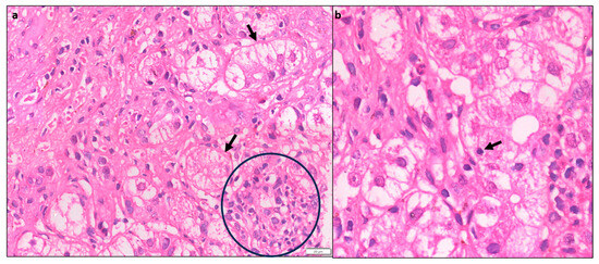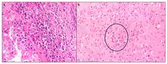 Emperipolesis is a lymphocyte or rarely a plasma cell within the cytoplasm of a hepatocyte (Figure 5). This finding has been reported in 65–78% of AIH biopsies [13]. The lymphocytes are usually CD8+ T lymphocytes [14]. Emperipolesis may induce hepatocyte apoptosis and thus may be associated with higher serum transaminase levels and more severe disease activity. Emperipolesis has also been described in drug-induced liver injury, primary biliary cirrhosis, and chronic viral hepatitis; therefore, it is not pathognomonic for AIH [10,13].