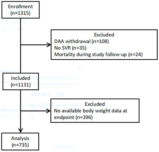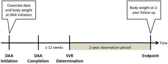 In Taiwan, patients with HCV infection receive DAA treatment through a nationwide government-funded program launched in 2017. All patients with HCV and proven active viremia, regardless of the duration and severity of liver disease, are eligible for DAA treatment, with the exception of patients with advanced- or terminal-stage disease or with a limited life expectancy of <6 months. As the availability of different DAAs evolved over time, the approved DAAs in Taiwan include daclatasvir/asunaprevir with or without ribavirin, ombitasvir/paritaprevir/ritonavir/dasabuvir with or without ribavirin, elbasvir/grazoprevir (Zepatier), glecaprevir/pibrentasvir (Maviret), and sofosbuvir-based (SOF-based) regimens including sofosbuvir + ribavirin, sofosbuvir/ledipasvir (Harvoni), and sofosbuvir/velpatasvir (Epclusa). The present retrospective cohort study included patients with HCV who received DAA treatment at the Chiayi or Yunlin branches of Chang Gung Memorial Hospital between 1 January 2017 and 31 October 2020. This study was approved by the Research Ethics Committee of Chang Gung Memorial Hospital and was conducted per the principles of the Declaration of Helsinki and the International Conference on Harmonization for Good Clinical Practice guidelines. Patients with confirmed sustained virologic response (SVR) and available body weight data at the start of DAA therapy and at 2 years after achieving SVR were included in this study. An SVR was defined as having an HCV RNA level below the lower limit of quantification at least 12 weeks after the end of DAA therapy. The study design is shown in Figure 1. Patients who discontinued DAA therapy, had no SVR, died during the follow-up period, or had no available body weight data were excluded from this study.