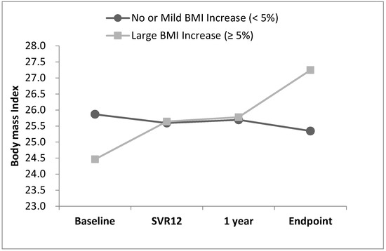 In our study, patients with HCV who received DAA therapy and achieved SVR were noted to experience a significant increase in BMI after 2 years of follow-up. The average BMI change rate in the overall study population from baseline to the endpoint was 1.0% ± 8.3%, which is consistent with the rates reported in previous studies [9,10,11,12]. Research indicates that the weight changes that occur after DAA treatment are significantly different from those that occur after interferon treatment. Patients often experience varying degrees of weight loss during interferon treatment and return to their pretreatment weight 6 months after stopping interferon treatment [16]. To the best of our knowledge, no study has investigated the long-term weight changes that occur after interferon treatment.