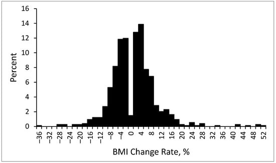 The distribution of the BMI change rate is presented in Figure 4. The average BMI change rate was 1.0% ± 8.3%. Specifically, the average BMI change rate was −0.5% ± 1.3% in the patients with no or a mild BMI increase and 2.78% ± 1.87% in the patients with a large BMI increase. For the top 10% of patients with the greatest weight gain, the average rate of BMI increase was 17.5% ± 9.9%.