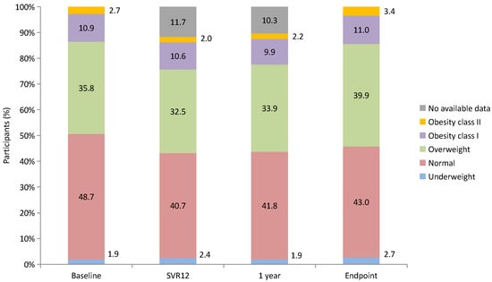 The changes in weight categories at each time point (baseline, SVR12, 1 year after SVR, and 2 years after SVR [endpoint]) are presented in Figure 5. During the 2-year follow-up period, the proportion of patients with overweight and obesity increased from 49.4% to 54.3%.
