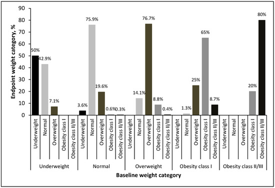The changes in weight category from baseline to the endpoint after stratification by weight category at baseline are presented in Figure 6. Of the 735 patients, 549 (74.6%) experienced no change in the weight category, whereas 111 (15.1%) were in a higher weight category at the endpoint. Among the patients with a normal BMI at baseline, at the endpoint, 19.6% had developed overweight, whereas 1% had developed obesity. Conversely, for the patients with overweight and obesity, more patients had an improved BMI than had a worse BMI. At the end of the follow-up period, 14.1% of the patients with overweight at baseline had a normal BMI. Among those with class I obesity at baseline, 1.3% had a normal BMI at the endpoint, and 25% were overweight.