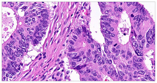 Moderately differentiated conventional adenocarcinomas (the usual type)—loss of nuclear polarity, nuclear pleomorphism, mitotic activity present. Hematoxylin–eosin stain ×400.