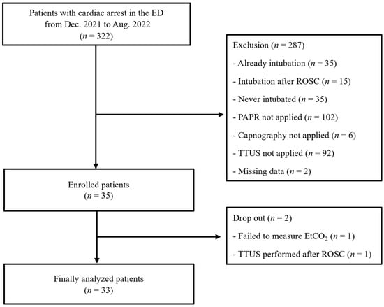 A total of 322 patients with cardiac arrest underwent CPR in the ED during the study period. Patients who were already intubated (n = 35), intubated after the return of spontaneous circulation (ROSC) (n = 15), had never been intubated (n = 35), received CPR without PAPR (n = 102), did not apply EtCO2 (n = 6) or TTUS (n = 92), and had missing data (n = 2) were excluded. One case in which EtCO2 could not be measured and one case in which TTUS was performed after ROSC dropped out, and a total of thirty-three patients were analyzed (Figure 2).