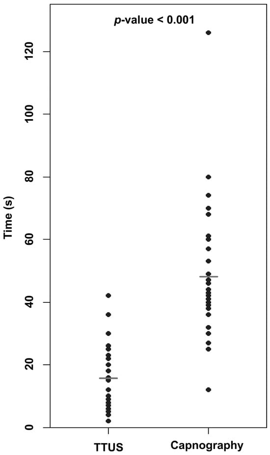 The time (median (IQR)) to acquire the EtCO2 value was 45 (37–58.5) s, while the TTUS approach required 12 (8–23) s, with TTUS being significantly faster (p < 0.001) (Table 2, Figure 3). There was no statistically significant correlation between the TTUS proficiency of the physician and the image acquisition time (Supplementary Table S1). Lung ultrasound was performed after confirming the tube inside the trachea in twenty-six cases (79%), and inspection of the bilateral upper lung field revealed one case of unilateral lung sliding, indicating bronchial intubation.
