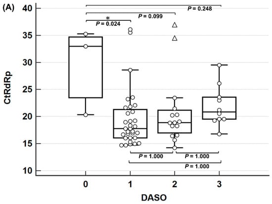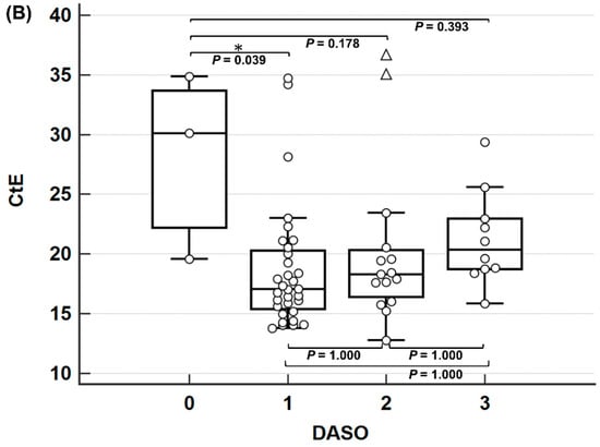 Distribution of Ct values for (A) RtRp and (B) E genes in the polymerase chain reaction (PCR)-positive samples compared using sample collection days after symptom onset and using an analysis of variance (ANOVA) with a Bonferroni post hoc test. The p-values from the Bonferroni test are presented. The circles represent the Ct values of each subject, triangle represent extreme outliers confirmed by Tukey’s methods, and asterisk represent the subgroups that showed significant difference with p-value < 0.05. Abbreviation: DASO, days after symptom onset.