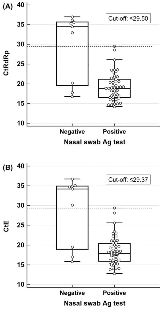 None of the PCR-positive patients with Ct values higher than a specific cut-off value were considered positive in the antigen test. These cut-off values were higher in the nasal swabs than in the oral swabs because one subject with a Ct value near but lower than 30 showed antigen-positive results in their nasal swabs and antigen-negative results in their oral swabs (Figure 2). In contrast, some participants showed negative antigen test results despite having a low Ct value in the PCR test, suggesting a sufficiently high viral load.