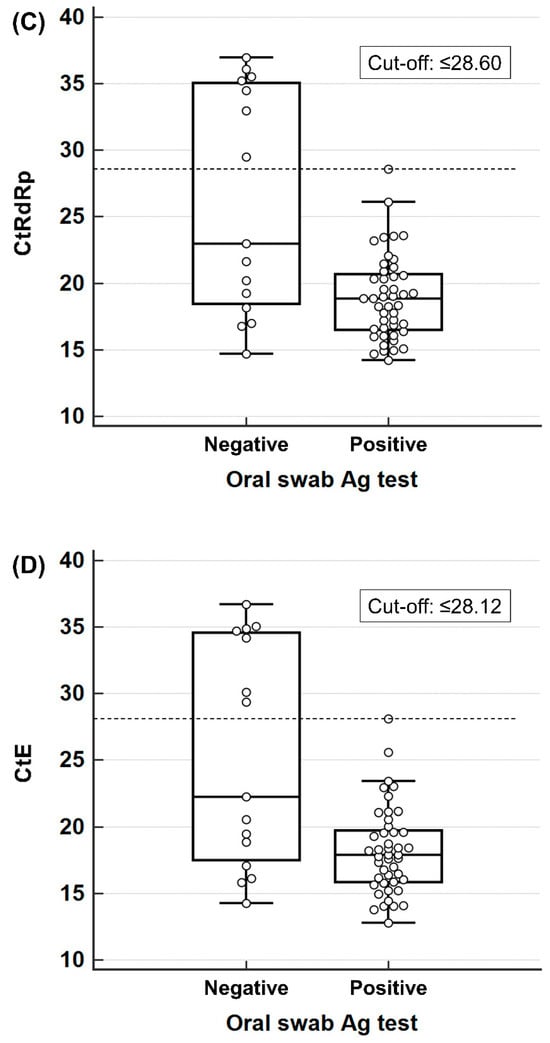 Distribution of Ct values and maximal antigen test sensitivity limits for (A) RtRp, (B) E in the nasal swab samples, (C) RtRp, and (D) E in the oral swab samples. The circles represent the Ct values of each subject.