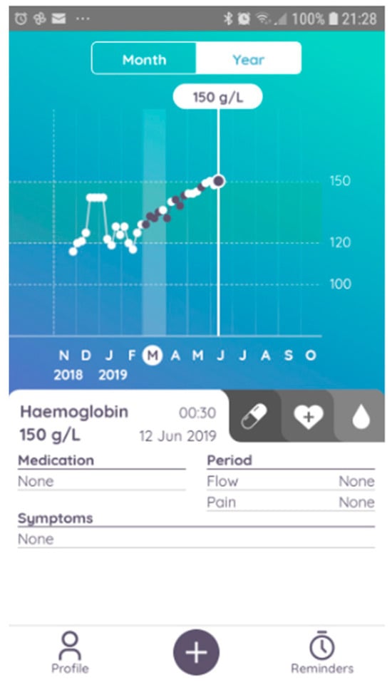 In this pilot trial, we used a CE-marked POCT device designed for self-testing, able to measure Hb from a drop of capillary blood obtained via a finger prick (the Luma device, Entia, London, UK, CE certificate number 718734). Luma derives Hb concentration via haematocrit and mean corpuscular haemoglobin concentration in a 4–8 μL sample in 60 s by centrifugation followed by photometry. The device measures 78 × 83 × 52 mm and weighs 96 g (Figure 1). Capillary blood is drawn into a small plastic cuvette by capillary action loaded simply into the device, and a Hb result is obtained with a single button press. The device displays the Hb result on its integrated touch screen, and up to 32 results at once can be transferred to the associated mobile application via the photographing of a quick response (QR) code generated by the device. The Luma app allows the patient to view their cumulative Hb results and share the results with their HCPs, who are able to access results via email. The participant can navigate through the history of their results with the ability to annotate them with medication, symptoms, and side effect information (Figure 2). For patients who did not have a smartphone, the results could be read off the device to the HCP over phone calls. The Luma results were transferred into our kidney information management system (the Bradford, Hull, Leeds, and York (BHLY) system, VitalPulse, Chelmsford, UK), which allowed the results to be viewed separately, alongside, lab derived full blood count (FBC) results.