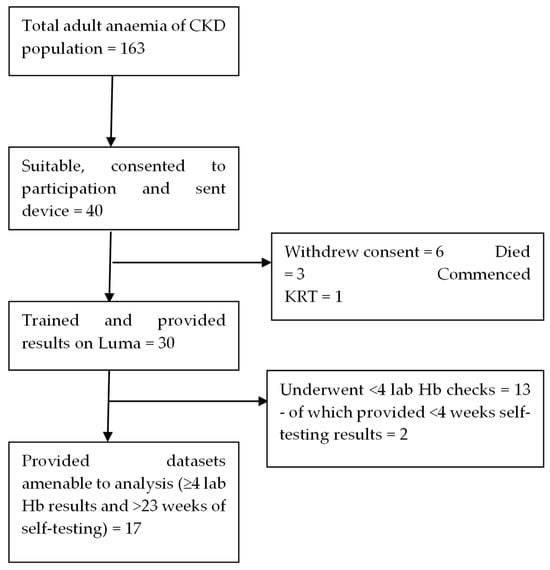 From a total of 163 possible adult non-dialysis-dependent CKD patients requiring ESAs for the management of their anaemia of CKD, 48 patients (29.4%) were deemed appropriate for inclusion in and consented to the trial. The pilot trial generated 1515 Luma and 139 lab Hb results.