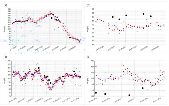 Examples of participants with various patterns of variability in their Luma testing. Vertical axis gridlines are at every month. (a) Low Luma testing variability. (b) High Luma testing variability. Note the large spread of Luma results throughout. (c) Average Luma testing variability. (d) High variability improves to low variability. Note the improving correlation with lab values. Green dots: Raw Luma Hb results, Black dots: Lab Hb results, Red squares: 4 point moving average (4PMA) of Luma Hb results. Blue crosses: 8PMA Luma Hb results. Hb: haemoglobin.