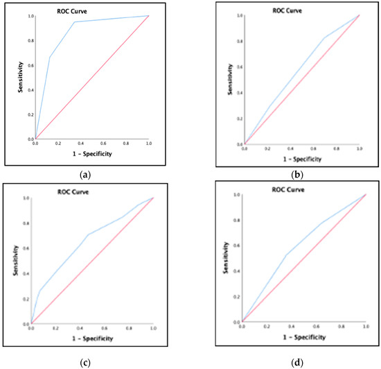 The AUC clearly showed a good discriminative ability within the diagnosis section to determine nutritional status (Figure 1a). However, it showed a failed discriminative ability in the nutritional intake section (Figure 1b) and weight and height for age section (Figure 1c) in determining nutritional status. Also, it showed a poor discriminative ability in the overall nutritional status section to determine nutritional status (Figure 1d).
