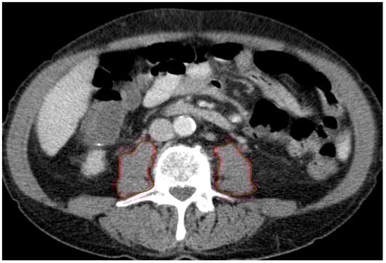 A board-certified radiologist blinded to all clinical data assessed the PMA (mm2) using a stationary workstation with dedicated software (Deep Unity Diagnostics 1.1.1.1, Dedalus Healthcare, Milan, Italy). Measurements were obtained from axial CT scans of the abdomen and pelvis during the portal venous phase, using a soft tissue kernel with a slice thickness of 3 mm and a reconstruction interval of 2 mm. The PMA was assessed in all patients at the level of the superior endplate of the third lumbar vertebra (L3) by manually tracing the right and left psoas muscles (Figure 1). The total PMA was calculated by adding the areas of both the left and right psoas muscles. Furthermore, the total PMA was adjusted for the patient’s body surface area (BSA), which was calculated using the Dubois formula: BSA = 0.007184 × height^0.725 × weight^0.425 (BSA: m2). This produced the indexed PMA (PMAi: mm2/m2).