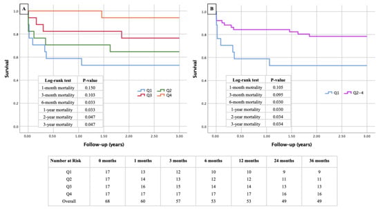 Kaplan–Meier curves with corresponding numbers at risk and log-rank tests for detection of short- and mid-term mortality regarding the presence or absence of sarcopenia. Figure 2 demonstrates Kaplan–Meier survival curves with a follow-up survival of 3 years post-surgery. In (A), all four quartiles of PMAi are demonstrated, whereas in (B), only the lowest quartile (defined as sarcopenic) was compared to the other non-sarcopenic quartiles.