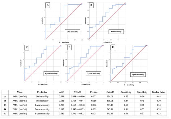 Additionally, receiver operating characteristic (ROC) curve analyses were performed to evaluate the predictive ability of PMAi and other clinical factors for 30-day, 90-day, 1-year, 2-year, and 3-year mortality. The area under the ROC curve (AUROC) was calculated to quantify the model’s ability to discriminate between survivors and non-survivors over these time frames. The optimal PMAi cut-off value for each time point was identified using the Youden index (YI), which selects the threshold that provides the best balance between sensitivity and specificity.