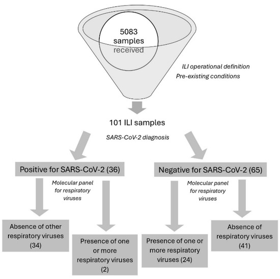 In this study, 5083 individuals whose samples were received during epidemiological weeks 33–42 of 2021 (August–October) were included (Figure 1). For the surveillance process, 101 typical symptomatic ILI cases were selected. Samples for the detection of respiratory viruses were collected from cases with acute episodes of fever, headache, and coughing with no more than 7 days of progression, along with symptoms such as adynamia, odynophagia, rhinorrhea, and respiratory distress. Similarly, patients with pre-existing diseases as a predisposing factor were included in the selection profile. Accordingly, SARS-CoV-2 infection was also used for the subsequent grouping of the cases, wherein 36 were positive and 65 were negative for the presence of this virus. The primary source of information was the data provided in the patient’s discharge report and epidemiological record (FE 345-346-348, INS) for each case.