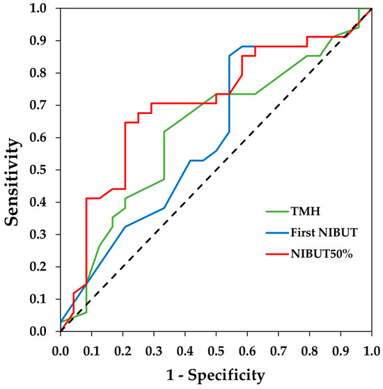 Receiver operating characteristic (ROC) curves of tear meniscus height (TMH), first non-invasive break-up time (NIBUT), and NIBUT50% measured with the Visionix VX120+ for the diagnosis of dry eye. The dotted line denotes the ROC curve if the classification is randomly estimated.