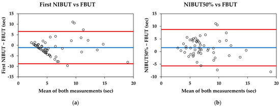 For the entire sample, the first NIBUT was significantly lower than the FBUT (5.34 ± 3.95 s and 6.44 ± 3.82 s, respectively; p = 0.007), and the NIBUT50% was significantly higher than the FBUT (7.99 ± 3.22 s and 6.44 ± 3.82 s, respectively; p = 0.002). The Bland–Altman data and plots are shown in Table 3 and Figure 2, respectively.