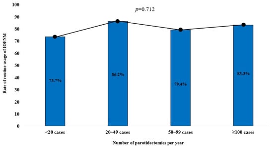 Among the respondents with <5 years, 5–9 years, 10–19.9 years, and ≥20 years of experience, 100% (10/10), 85.0% (17/20), 76.3% (29/38), and 75.0% (15/20) reported routine usage of IOFMN, respectively, indicating a decreasing trend of usage with increasing levels of experience. This trend exhibited a moderate linear-by-linear association (p = 0.089; Figure 1). Furthermore, among respondents who performed <20, 20–49, 50–99, and ≥100 parotidectomies per year, 73.7% (14/19), 86.2% (25/29), 79.4% (27/34), and 83.3% (5/6) reported routine usage of IOFMN, respectively, although no linear-by-linear association was observed for this trend (p-value = 0.712; Figure 2).